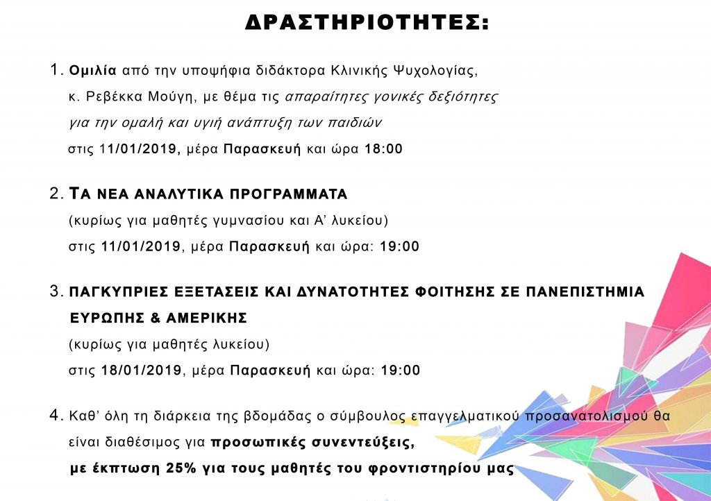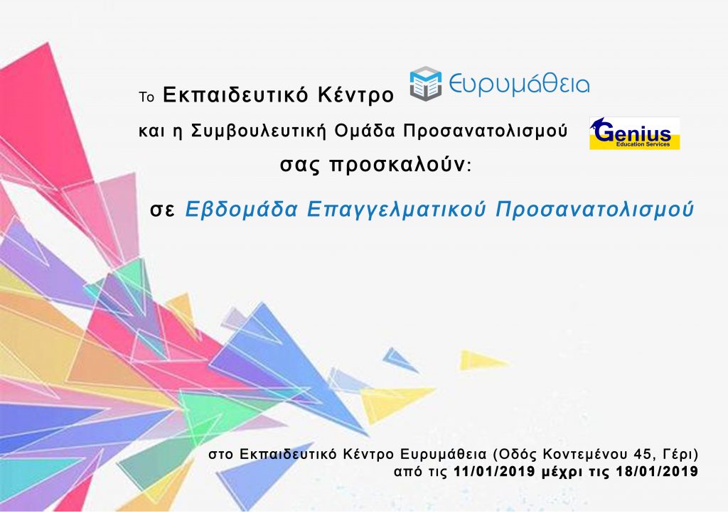 Το Εκπαιδευτικό Κέντρο Ευρυμάθεια σας προσκαλεί σε διάλεξη Επαγγελματικού Προσανατολισμού την Παρασκευή 11 Ιανουαρίου 2019 στις 19:00. Θα προηγηθεί διάλεξη από τη διδακτορική Φοιτήτρια Ρεβέκκα Μούγη με θέμα “Απαραίτητες γονικές δεξιότητες για την ομαλή και υγιή ανάπτυξη των παιδιών”.